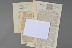 MÉDECINE. 4 imprimés XVIIIe-XIXe. « Grana Angelica ou véritables pilules écossoises laissées à la postérité par le dicter Patrice Anderson » (XVIIIe, 40 x 25 cm). « Eau du Sr Trottier de Bois-Semé » (1772, 1 p. in-8). « Avis sur le nouveau traitement de la maladie des yeux et les propriétés de l'eau ophtalmique du Sr Loche […] » (1784, 4 pp. in-8). « Compagnie générale de la conservation des corps humains par de nouveaux procédés d'embaumement et de momification » (vers 1837, 1 p. in-4).