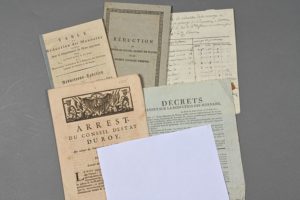 MONNAIES. 5 documents sur la réduction des monnaies. - Pièce manuscrite XVIIIe : « Table de réduction de la monoye de France en monoye de Piemmont » - 2 plaquettes imprimées (premier empire) : « Réduction de l'ancien en nouvel argent de France et en argent courant d'Empire » (1809) et « Table de réduction des Monnoies circulant dans le département de l'Ems supérieur » (1812, bilingue français/allemand) - 2 imprimés : « Arrest du Conseil d'Estat du Roy qui indique des diminutions sur les espèces & matières d'or et d'argent, du 4 décembre 1725 », et « Décrets rendus sur la réduction des monnaies » (1810)