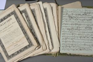 MUSIQUE. - Méthode de musique avec planches à système : " La Musique étudiée comme science naturelle, certaine, et comme art, ou Grammaire et dictionnaire musical par G.L. Chrétien, musicien de S.M. l'Empereur et Roi ", [1811]. Texte et 17 planches gravées dont 9 à système. - " Collection de pièces nouvelles pour le piano ". Collection complète des 12 livraisons, chacune portant, en première page, la signature autographe des différents compositeurs (Paer, Pfeffinger, Rigel, Mozin, Le Moyne, etc.) - [GLÜCK]. " Cythère assiégée, opéra ballet en trois actes, représentée par L'Académie Royale de Musique le 1er août 1775, mis en musique par M. le chevalier Gluck ". Un volume in-folio, reliure en velours usagée. A Paris, au Bureau d'abonnement musical ru du Hazard Richelieu ", imprimé par Récoquilliée, 206 pp. - partition manuscrites du début du XIXe : " Beethoven. Op. 38 trio - violon ", " sonata per l'arpa il violino del. Sig. Krumpholtz " - une chemise contenant diverses autres partitions imprimées (Ignace Pleyel, Steibelt, etc.).