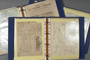 PAPIERS DE COLLECTION ET PAPIERS DIVERS. 6 classeurs contenant environ 170 documents anciens, majoritairement XVIIIe-XIXe. Dessin d'une étude de chien (porte la date « 1784 »), gravures, lettres des douanes impériales, factures anciennes, faireparts anciens, quittances fiscales XVIIIe, imprimés italiens, dessin d'un cerf, documents sur l'exposition universelle de 1889, documents sur la loterie, connaissements maritimes, lettres de voiture, « lettres de maitrise » de « marchand mercier, grossier et joaillier » (Caen, 1682, sur parchemin), souscriptions à divers ouvrages, passeports, journaux XVIIIe (Gazette, Journal général, Le Rédacteur, La Sentinelle, Le Publiciste, Journal des hommes libres, etc.), imprimés révolutionnaires, lettres circulaires, lettres publicitaires, documents ecclésiastiques, brochures, documents sur l'assassinat de Sadi Carnot (dont grande photo sur son enterrement), tontine, etc.