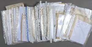 PARCHEMINS. Une boite d'archives contenant 66 parchemins et documents anciens, XVe-XVIIIe. Tous avec fiche donnant une description au moins partielle. Aveux, ventes, foi et hommages, mariages, etc. concernant diverses régions de France et de diverses époques : 1 du XVe, 14 du XVIe, etc.