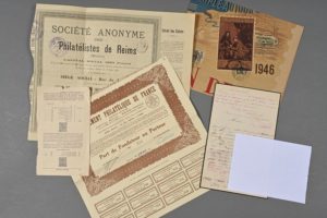 PHILATÉLIE. - Affiche du Salon de la philatélie (1946). - Action de 25 francs de la Société Anonyme des Philatélistes de Reims (1898). - « Part de fondateur au porteur » du Groupement philatélique de France (1930). On joint une lettre d'une collectionneuse à un philatéliste lui faisant part de ses desideratas (1864).