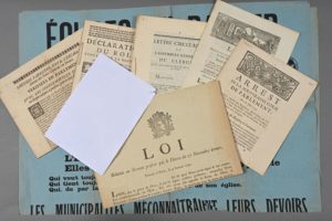 RELIGION. 5 imprimés et 3 affiches, XVIIe-XXe. « Lettres patentes pour l'establissement des Pères Capucins en France » (vers 1662, 4 pp. gd in-folio, signatures). « Déclaration du Roi concernant la Religion, donnée à Versailles le 14 mai 1724 » (15 pp. petit in-4, imprimé à Périgueux en 1757). « Lettre circulaire de l'assemblée générale du clergé aux archevesques et évesques de France » (1755, 16 pp. in-4). « Loi relative aux rentes constituées sur le Clergé, sous le nom des Syndics des diocèses » (oct. 1791). « Arrest de la souveraine court de Parlement du 28 juin 1743 qui enjoint aux magistrats […] d'assister aux processions […] » (7 pp. in-4). Affiche : « Loi relative au Serment prescrit par le décret du 27 novembre dernier, donnée à Paris le 9 janvier 1791 ». Affiche : « Lettres patentes du roi sur le décret de l'Assemblée nationale […] qui prohibe la disposition de tous bénéfices à l'exception des cures » (27 nov. 1789). Affiche du XXe sur papier bleuté : « Églises en danger, qui les réparera ? » éditée par « Tracts et affiches Jeanne d'Arc » et imprimée à La Flèche.
