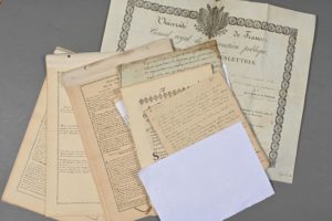 SCIENCES. Documents divers. Manuscrit du début XIXe d'une main non identifiée d'un cours sur les sucres (7 pp. ½ in-4 « Il y a 4 espèces de sucres 1er le sucre de canne ou sucre proprement dit 2° le sucre liquide 3° le sucre de champignon 4° le sucre de raison […] »). Diplôme de bachelier en lettres signé par Georges CUVIER (sur parchemin, 1822). Arrêt de la Cour de Parlement du Dauphiné ordonnant aux habitant de nettoyer « tous arbres & buissons, d'en enlever les coques, pelotons & nids de chenilles » (1775). Fragment d'un manuscrit de géométrie début XIXe illustré d'une douzaine de croquis au lavis (8 pp. in-4). Lettre A.S. d'Émile Deschamps à Constant DUMÉRIL. Deux lettres d'un médecin au sujet d'une gangrène (1829). Dossier de 12 lettres tapuscrites signées de A. NEMIROVSKY inventeur de l'avion radio chirurgical (en-têtes « Aérochir Némirovsky-Tilmant » (1918-1921). Ensemble de feuillets manuscrits tirés du livre d'Armand Reclus sur la carte géologique de la France.