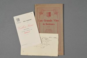 VINS DE BORDEAUX. 3 documents. - [Château-Lafitte]. Pièce manuscrite en vers, 1 p., 1ère moitié du XIXe. « Voulez-vous être heureux ? Point de château brillant / À plein verre buvez de bon vin de Lafitte ; / […] ». - [Veillon frères, négociants à Bordeaux]. Dépliant (vers 1911-1912) contenant les prix de ses vins dont de grands crus (Yquem, Margaux, Mouton-Rothschild) + brochure éditée par Veillon frères, « Les grands vins de Bordeaux - leur histoire, leur vinification, l'art de les boire » [1912].