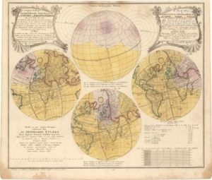 [Eclipse]. LOWITZ (Georg Moritz). Le monde éclipsé, ou Représentation géographique de l'éclipse de la terre ou du soleil qui arrivera le 25 juillet 1748... Première Feuille... Norim[berg], prostat in Officina Homanniana, 1747. 1 carte gravée sur cuivre, env. 46 x 55 cm., sur feuille 50 x 60 cm., coloriée (taches en marge, 2 cachets grattés). La planche présente trois représentations successives du globe terrestre où l’on peut voir l’évolution des surfaces éclairées et celles placées dans l’ombre. Dédicace gravée en latin de l’auteur au mathématicien suisse Leonhard Euler. 2 cartouches de titre en français et en allemand.