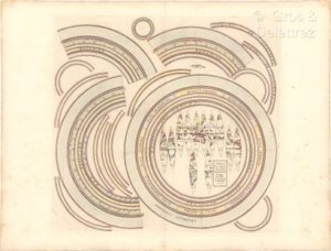 [Cosmographie]. OLIVIERI (Bernardino). Circoli per formare la sfera armillare. Roma, Presso la Calcografia Camerale, 1795. 1 planche gravée sur cuivre, 39 x 41,5 cm. sur feuille env. 45 x 60 cm., colorié, reste d’onglet au v° (légères rousseurs marginales). Planche composée de plusieurs figures et pièces destinées à être découpées et montées. Elle est extraite du "Nuovo Atlante Geografico Universale" publié à Rome entre 1792 et 1801. Cette planche comprend des segments du globe divisés en douze parties, ainsi que d'autres éléments destinés à la construction d'une sphère armillaire. Si elle était assemblée, la sphère armillaire aurait un diamètre d’environ 28 cm, tandis que le globe central en segments aurait un diamètre d'environ 5 cm. Les divers anneaux de la sphère armillaire incluent l'équateur, le tropique du Cancer, le tropique du Capricorne, ainsi que les zones et cercles polaires et antarctiques. Autour de ces segments, des cercles concentriques indiquent les zones climatiques telles que la zone tempérée, la zone froide et la zone torride, avec des annotations en latin et en italien désignant les cercles polaires, l'Equateur et les tropiques.
