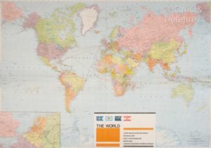 [Carte murale]. [Monde]. COMPAGNIE MARITIME BELGE. The World. Bruxelles, Institut Cartographique P. Mantnieks, 1970. 1 carte imprimée en couleurs (env. 83 x 120 cm.), montée sur gorge et rouleau en bois (légères salissures, petites fentes marginales). Carte murale du monde d'après la projection de Van der Grinten, à l’échelle 1:34.500.000 traçant les itinéraires de la Compagnie Maritime Belge et Deppe Line et de Dart Container Line.