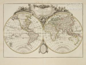 [Atlas]. LATTRE (Jean). Atlas moderne ou collection de cartes sur toutes les parties du globe terrestre par plusieurs auteurs. A Paris, Lattré, 1787. In-folio, [3] f., 37 pl., cartonnage ancien modeste, dos à nerfs (cart. très frotté, dos découvert, premier cahier dérelié, faux plis sur la 1e pl., mouill. sur qq. f.). Edition de 1787 de l’atlas de Jean Lattré composée d’un titre frontispice, 1 f. de texte, et une table des cartes de l’atlas. Il renferme une estampe montant une sphère armillaire, et 36 cartes gravées sur cuivre rehaussées de limites coloriés et de bordures jaune. Ces cartes incluent une mappemonde, des cartes générale de l’Europe, l’Asie, l’Afrique, les Amériques, la carte de la France divisée en 83 départements, une carte de la France et de l’Italie en 2 feuilles chacune, et une carte de l’Allemagne en 4 feuilles. Il inclut également des cartes montrant des régions en Asie et Afrique, tels que la Chine, les Indes, l’Egypte, la Barbarie, et 2 cartes de la Terre Sainte.