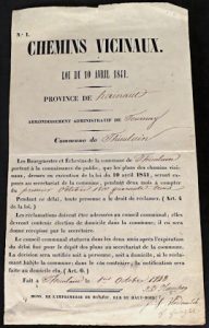 (1). Placard annonçant l'exposition des plans des futurs chemins vicinaux à Thieulain (Hainaut, Tournai). 1er octobre 1843.— (2). "Acquisition au profit de Monsieur le Baron Guillaume de Nottebohm, Consul général de Danemarck & négociant à Anvers. D'une belle Rizerie au quai Plantin et de deux maisons au Scheldeken, n° 12 & 14, moyennant frs. 74100, payés comptant. Acte du 1er aout 1864", 12 ff. in-f°, sous couv. en pap. à en-tête du notaire.— (3). Vente aux enchères d'un bien en France, époque napoléonienne. [10] ff. dont 2 volants (complet ?).