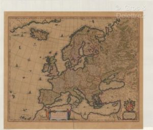 [Europe]. VISSCHER (Nicolaes). Europa delineate et recens edita, NobiliBimo Prudent. . . [Amsterdam], c.1680. 1 carte gravée sur cuivre, 44 x 55 cm, (feuille), limites coloriées, contrecollée sur papier fort moderne (papier bruni). Exemplaire très soigné de cette carte d’Europe, dont les noms de pays, de mers et océans, le cartouche, et chaque point indiquant une ville ont été rehaussés à l’or.