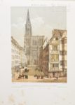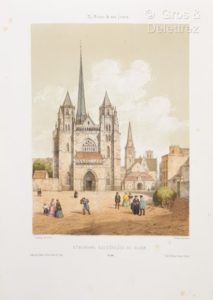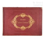 [France]. ASSELINEAU. France. Eglises et cathédrales. Paris. F. Sinnett. [ca. 1853-1876]. In-folio oblong (env. 31 x 41 cm.), 24 pl., demi-basane rouge d’époque, dos lisse et muet, titre doré sur le plat sup. encadrement doré et à froid (frott., dos fendu en queue, rousseurs). Suite de 24 planches illustrant les églises et cathédrales de nombreuses villes françaises dont l'église Saint-Jacques à Dieppe, la Cathédrale Saint-Bénigne et l'église Saint-Michel à Dijon, Notre-Dame de Paris, Les cathédrales de Strasbourg, Nantes, Rennes et Châlons Toutes imprimées en couleurs, presque toutes par Destouches, d’après les dessins d’Asselineau (21), et de Chapuy (2), lithographiés par Asselineau, et de Lebreton (1) lithographié par lui-même. Ces planches sont très probablement parues dans La France de nos jours de Charles Mercereau, une série 475 lithographies publiée de en nombreuses livraisons entre les années 1853 et 1876. Souvent les collectionneurs ou les libraires formèrent des sous-recueils regroupant les planches par artiste, par région, ou par thème.