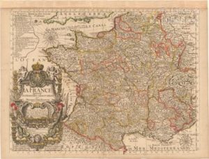 [France]. BAUDRAND (Michel Antoine) ; ROUSSEL (Claude), grav.. La France suivant les nouvelles observations. A Paris, chez Claude Roussel, 1738. Carte gravée sur cuivre, 41,5 x 55 cm., limites coloriées (marges un peu jaunies, celle de tête remplacée). Belle carte de France dessinée par l’abbé Baudrand, gravée et publiée par C. Roussel. Elle est ornée d’un grand cartouche de titre sur lequel figurent les armes de gouvernements, pays et provinces ; une légende figure en haut à gauche, les échelles sont figurées sous le cartouche ; deux roses des vents ornent la Manche et la Méditerrannée.