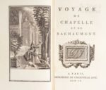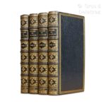 [France]. LA MESANGERE (Pierre de), éd. Voyages en France ornés de gravures avec des notes par La Mésangère. A Paris, chez Chaigneau aîné, [1796-1798]. 4 volumes in-18, pl., maroquin bleu, dos à 5 nerfs, titre, tomaison et date dorés, caissons orné de petit fer doré, triple filet doré bordants les plats, double filet dorés sur les coiffes et coupes, dentelle intérieure, tranches dorées sur marbrure [Chambolle-Duru] (très légers frott. aux coins, coiffe sup. du t.3 et mors sup. du t.1, très rares rousseurs). Première édition de cette réunion de 11 récits de voyages, chacun suivi de notes par Pierre de la Mésangère. L’on y trouve notamment : Voyage de Chapelle et de Bachaumont ; Voyage de Languedoc et de Provence par Le Franc de Pompignan ; Voyage de Fléchier en Auvergne ; Voyage de Gresset à La Flèche ; Voyage de Paris à Marseille par la Bourgogne et par le Bourbonnais par Bérenger ; Voyage à la Grande Chartreuse ; Voyage de Paris en Limosin par La Fontaine Edition illustrée de 30 planches et d’une vignette au titre d’un récit, gravées sur cuivre par Bertaux, Le Mire, Gaucher, Duval, Du Parc Gaitte, Copia d'après Cornille, Le Mire, Monnet, Malapeau, Villerey. Cet exemplaire renferme une planche non signalée par Cohen, soit 31 planches, dont la planche érotique placée en regard de la p. 66 au tome 1. Très bel exemplaire tiré sur papier vélin et relié avec élégance et maîtrise par Chambolle-Duru. (Cohen 1048-1049).