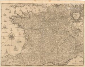 [France]. [TASSIN (Christophe)]. Carte de France. [Paris, Tassin, 1634]. Carte gravée sur cuivre, 37,5 x 50 cm. (marques de plis dont un restauré au dos, petites taches dans les marges de tête). Carte du royaume de France couvrant à l’est jusqu’au Tyrol et la Ligurie. Elle a paru dans l’atlas de C. Tassin, Cartes générales de toutes les provinces de France . Les mers et l’Océan sont ornés de figures de navires, et d’une rose des vents. (Pastoureau, Tassin II A [1]).
