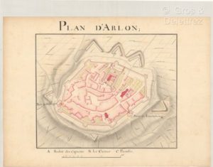 [Manuscrit]. [Arlon]. [Plan de] Arlon. [XVIIIe siècle]. 1 plan manuscrit, lavis d'encre et aquarelle sur papier, 30,5 x 37,6 cm. sur feuille de 41 x 56,7 cm. (très légères rousseurs).