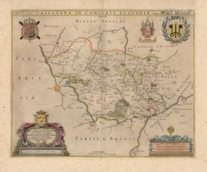 [Cassel]. BLAEU (Joan) ; HONDIUS (Henricus). Ditio casletana in comitatu flandriae vulgo Cassel Ambacht. Amsterdam, Henrici Hondy, [1659-72]. 1 carte gravée sur cuivre (45 x 54 cm.), contours coloriés à l’époque, (restaurations, légères rousseurs marginales). Belle carte du domaine de Cassel dans le comté de Flandre, communément appelé Cassel Ambacht par Vedastus du Plovich, Antoine Sanders (1586-1664) et publié par Henricus Hondius (1597-1651). Elle est finement décorée de deux grands cartouches et des armoiries de la Flandre. Cette carte est apparue pour la première fois dans Flandria Illustrata, vol. II, de Sanderus (Köln : Cornelis van Egmondt c.s = Amsterdam Joan Blaeu, 1644). Cet exemplaire est publié en 1663 dans le quatrième volume de l’édition espagnole Atlas Nuevo, imprimée en 1659-72. (Van der Krogt, 2, 3290:2).