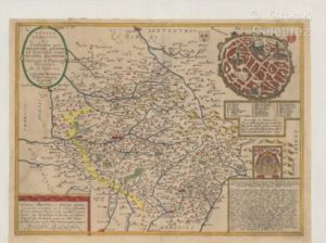 [Limousin]. BOUGUEREAU (Maurice), FAYEN (Jean). Totius Lemovici et consinium provinciarum quantum ad dioecesin lemouicensen scpectant. Novissima et Fidissima Descriptio. 1594. 1 carte gravée sur cuivre, 35 x 48,8 cm. sur feuille 36,5 x 49,5 cm., coloriée à la main (mouillures dans les marges latérales, atteignant la carte, petite fente sans manque vers la pliure centrale). Première carte gravée où se trouve représenté le Limousin. Publiée pour la première fois en 1593 par l’éditeur Bouguereau à Tours, elle se trouve ici dans une nouvelle édition donnée en 1619 à Paris par Jean Leclerc, qui avait racheté les cuivres de Bouguereau. En haut à droite de la carte figure un beau plan de la ville de Limoges, tandis qu'en bas à droite se trouve une dédicace de Jean Fayen à Annet de Levis, duc de Ventadour, gouverneur du Limousin, datée du 4 février 1594, surmonté d’armoiries. (Pastoureau, Leclerc A [27] ; Bouguereau [14] pour le cuivre original).