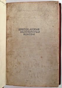 Second edition (1st ed. : Venice, 1495) of the correspondence by one of the most influential humanist philosophers of the early Italian Renaissance (1433-1499). Letters to Giovanni Pico della Mirandola, Angelo Poliziano, Bernardo Bembo, Ermolao Barbaro, etc. dealing with various subjects : religion, moral, music, Plato, philosophy, medicine, astronomy, books, mythology, etc. Illustrated with a schema in texto in the letter "Genelogia & Genesis Platonis". Ficino was the first translator of the extant works of Plato in Latin and as a reviver of Neoplatonism, ran the Florentine Academy created by Cosimo de' Medici. The philosopher and scholar Giovanni Pico della Mirandola (14631494) was one of his students. # Pollain 1478; # Hain 7062; # Goff F-155; # BMC II-443; # Stillwell F-155; # GW 9874; # USTC 744848. ^ Seconde édition (éd. orig. : 1495) de la correspondance de l'humaniste italien Ficino traitant de sujets variés (littérature, Platon, religion...). Plein veau du 18e s. (tables reliées à la fin au lieu du début, mors sup. part. joint).