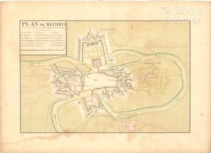 [Manuscrit]. [Mézières]. Plan de Mezieres avec les projets de Mr. le Mareschal de Vauban de l'année 1698. [XVIIIe siècle]. 1 plan manuscrit, lavis d'encre et aquarelle sur papier, 30 x 45,5 cm. sur feuille de 41 x 56,7 cm. (mouillures claires). Le cartouche du titre contient également l’échelle et la liste de 18 emplacements représentés sur le plan.