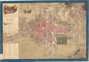 [Nancy]. MIQUE (Claude). Plan des villes, citadelle et faubourgs de Nancy dédié à la Reine. [Nancy], [1780]. 1 plan gravé sur cuivre, env. 71 x 103 cm. sur feuille 77 x 109 cm., colorié (marque de pli en 4, des manques et nbr accrocs réparés au verso, fentes au niveau des pliures). Avec une légende identifiant 103 lieux ou édifices figurant sur le plan. Il manque la colonne de texte d’ordinaire placée à droite du plan et intitulée Carte historique des principaux édifices de Nancy . Très joli coloris d’époque.
