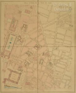 [Paris]. JACOUBET (Theodore). Atlas général de la ville, des faubourgs et des monuments de Paris. Paris, J. Andriveau-Goujon, [v. 1836]. 8 planches gravées, chacune de 70 x 57 cm. marges incl., pliées 35 x 29 cm., entoilage époque, étiquette de J. Andriveau-Goujon au verso de chaque feuille, chemise et étui époque assorti (étui usé). 8 feuilles extraites de l’Atlas général de la ville de Paris de Jacoubet, l’un des plus importants atlas de Paris antérieurs aux transformations haussmanniennes. Gravées sur acier par V. Bonnet, la lettre par J. M. Hacq, et aquarellées. Cet ensemble réunit : 1ère livraison : f. 11 (Parc Monceau - Avenue de Neuilly) , 12 (Abattoir du Roule). 2e livraison : f. 13 (Rue St Lazare), 14 (Opéra - N.-D. de Lorette). 4e livraison : f. 21 (Etoile - Concorde - Palais Bourbon). 5e livraison: f. 22 (Place Vendôme - Tuileries), 23 (Louvre - Palais-Royal - St Eustache), 32 (Notre-Dame et île de la Cité). (Pinon & Le Boudec, p. 94).