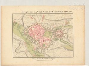 [Manuscrit]. [Pas-de-Calais]. Plan de la ville cité et citadelle d’Arras. [XVIIIe siècle]. 1 plan manuscrit, lavis d'encre et aquarelle sur papier, 30 x 41 cm. sur feuille de 41 x 56,7 cm. (légères rouss. dans les marges). Titre, échelle et courte légende hors du cadre.