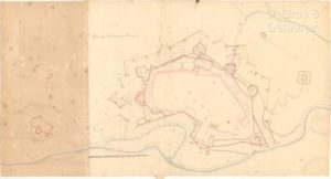 [Manuscrit]. [Provence]. Plan de Colmars en Provence. Plan manuscrit sur 2 feuilles assemblées, [XVIIIe s.], 38,5 x 72 cm., sans marges, crayon, encre et lavis sur papier (traces de plis, qq. rouss., le demi-f. de gauche est bruni). Représentation de la forteresse de l’actuelle Colmars-les-Alpes implantée au bord du Verdon. Echelle figurée sur la carte.