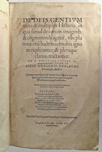 (Antiquité, Mythologie) - GIRALDI, Giglio Gregorio.- De deis gentium [...]. Basileae, per Joannem Oporinum, (1548). In-f° : [6]-1/257-263/365-371/764-[68] pp. (blank lvs a4 and AAa4 lacking, two jump paginations, light marginal dampstains, first...