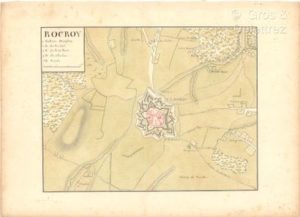 [Manuscrit]. [Rocroi]. Rocroy. [XVIIIe siècle]. 1 plan manuscrit, lavis d'encre et aquarelle sur papier, 31 x 40,5 cm. sur feuille 41 x 56,7 cm. (légères rousseurs dans les marges). Plan du fort de Rocroi et de ses alentours. Une légende en haut à gauche dont les noms des cinq bastions du fort.