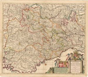[Savoie]. DANCKERTS (Justus). Novissima Descriptio Tabulae Generalis Ducatus Sabaudiae Principatus Pedemontii Comitatus Nicaeensis Amstelodami, Justinum Danckerum, [fin XVIIe s.]. 1 carte gravée sur cuivre, env. 51 x 59 cm. sur feuille env. 54 x 62 cm., limites coloriées (craquelures dans les marges, coin sup. droite restauré). Cette carte représente une description détaillée du Duché de Savoie, du Principauté de Piémont, du Comté de Nice, du Duché de Montferrat, ainsi que des principales régions adjacentes, notamment une grande partie du Duché de Milan et de la République de Gênes. Elle est ornée d’un beau cartouche de titres et d'échelles décoratives, embellie des armoiries et chérubins.