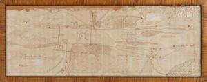 [Manuscrit]. [Allemagne ; Rhin]. [Carte d'une partie du Rhin]. [s.l., XVIIIe s.]. Plan manuscrit, sous verre et cadre moderne, env. 34 x 94 cm. (à vue), 40 x 100 cm. (cadre) encre sur papier (petits manques dans la partie haute et sur un pli, brunissures, une déch. sans manque ; accidents superficiels au cadre ; non examiné hors du cadre). Beau plan manuscrit, à l’encre noire avec quelques rehauts d’encre rouge, sur papier, contrecollé sur un feuillet. Orienté nord en bas à droite, il représente le cours du Rhin et le détail des aménagements de ses rives, aux alentours de Mayence, au confluent avec le Main. Limité à gauche par Bischeim (peut-être actuelle Bischofheim) et Laubenum (Laubenheim) sur l’autre rive ; et à droite, par Walf (actuelle Walluf) et Mombach en face. L’on y trouve mentionnés les prés, marais et vignobles, ainsi que des chapelles, cloîtres et moulins. Trois ponts franchissent le fleuve, l’un d’entre eux dessiné sur une petite pièce de papier contrecollée.