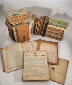[Allemagne ; Sarre]. Important ensemble de publications et de notes manuscrites concernant cette région rattachée successivement à la France et à l’Allemagne. XXe s. Etat d’usage convenable. Un carton, contenant une soixantaine de volumes ou fascicules, dont les n° 1 à 10 du Bulletin de la Société des Amis de la Sarre (1923-1934), les n° 1 à 7 en double ; s’y ajoutent le Journal des Français de la Sarre, n° 1 à 8 (janvier 1929 - octobre 1930), le Journal de la Sarre, n° 1 à 28 (nov. 1931 - janv. 1935) ; un dossier de notes manuscrites et dactylographiées dans une chemise intitulée « Chroniques régionalistes », comprenant des articles autographes sur la Lorraine par Ch. Berlet, Gilbert Maire, Jean-Julien, Dumont Wilden, Maurice Toussaint, une partie touchant également le nationalisme flamand, « flamingantisme », ; un dossier dans une chemise titrée « Etudes de personnalités messines » contenant des articles autographes.