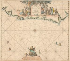 [Espagne]. [Carte marine]. VAN KEULEN (Johannes), ed. Pascaert van de kust van Biscaia beginnende van Castro tot Luarca, met al diepten en drooghten t Amsterdam, by J. Van Keulen, [XVIIIe s]. 1 carte gravée sur cuivre, env. 50 x 58 cm., coloriée (qq. petits trous dont 4 restaurés, 2 petites déch. marg. restaurées). Carte marine montrant la côte de Cantabrie et Asturies, depuis Castro-Urdiales jusqu’à Luarca, orientée nord en bas. Très décorative, elle est ornée d’un cartouche de titre montrant la cueillette et le commerce de fruits (châtaignes ?), et d’un cartouche d’échelle surmonté d’une figure allégorique féminine tenant une ancre et un perroquet. Carte no. 24 de l'atlas de Van Keulen, De Nieuwe Groote Lichtende Zee-Fakkel, qui parut pour la première fois en 1680 et fit l’objet de nombreuses éditions jusqu’en 1753.