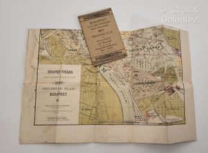 [Hongrie]. Budapest fováros legújabb tervrajza rövid útmutatóval. Budapest, [v. 1891]. In-12, 23 p., 1 plan dépliant mesurant 70 x 55 cm. (si déplié), coloris original (légères rouss. marginales, manque dans la marge gauche, des fentes sans manque au niveau des plis). Plan de Budapest qui montre en particulier le chemin de fer public et électrique accompagné d’un petit guide de 23 pages. Ce plan a été conçu et gravé par l'institut cartographique Lajos Károly Posner et fils.