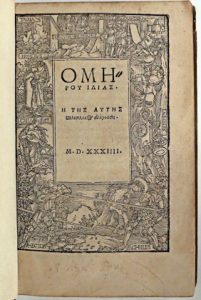 (Auteur de l'antiquité) - HOMERUS.- lÂiasf- OdvooEia. Батрахоџуоџахих, vßvoi, Iß[...]]. [En grec : (Strasbourg, Wolfgang Köpfel und Peter Braubach)], 1534. 2 vol. in-12° : 277-[3] [engr. title incl.], 251-[5]-[56] lvs (errors in...