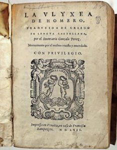 (Auteur de l'antiquité) - HOMERUS.- La Ulyxea, traduzida de griego en lengua castellana, por el Secretario Gonçalo Perez. Nuevamente por el mesmo revista y emendada [...]. Impressa en Venetia, en casa de Francisco Rampazeto, 1562. In-8° :...