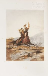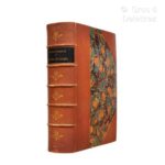 [Afrique]. FROMENTIN (Eugène). Sahara & Sahel. I. Un été dans le Sahara. II. Une année dans le Sahel. Paris, Plon, 1879. Fort in-4, demi-maroquin orangé à coins, dos à 5 nerfs, pièce de titre noire, fleurons dorés, date frappée en queue, double filet doré aux plats, tête dorée [Dupré] (coiffes, nerfs et coins frottés). Edition illustrée de 12 eaux-fortes par Lerat, Courty et Rajon, d’une héliogravure par le procédé Goupil et de 45 gravures en relief d’après les tableaux, dessins et croquis d’Eugène Fromentin. Tirage de luxe limité à 208 exemplaires numérotés : un des 50 sur papier Whatman (n° 27), contenant les eaux-fortes en 4 états (état définitif, et 3 états avant la lettre, dont un en sanguine et un sur Chine), et les gravures en relief en 2 états (état définitif et un autre sur Chine).