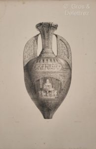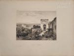 [Architecture mauresque]. GIRAULT DE PRANGEY (Philibert-Joseph). Monuments arabes et moresques de Cordoue, Séville et Grenade, dessinés et mesurés en 1832 et 1833. A Paris, chez Veith & Hauser, [1836 ?] - 1837. Grand in-folio, en feuilles sous couverture de livraison, toile au dos (dos usé, qq. mouillures claires, qq. rousseurs ; certains f. et pl. rapportés d’un autre ex.). Rare édition originale de ce recueil de 44 lithographies réalisées d’après les dessins de l’archéologue et historien de l’architecture islamique P.-J. Girault de Prangey (1804-1892). L’ouvrage se compose de 3 parties. Volume 1. Mosquée de Cordoue. Vues générales intérieures, détails et plans. [2] f. (titre, texte), 8 planches (pl.6 mal chiffrée 3). - Volume 2 - La Giralda et l'Alcazar de Séville. [2] f. (titre, texte), 6 planches. - Volume 3 - Souvenirs de Grenade et de l'Alhambra. [7] f. (titre, texte, table), 30 planches. Seule cette dernière partie est datée de 1837. Certaines planches portent un petit cachet à sec aux armes de l’auteur.
