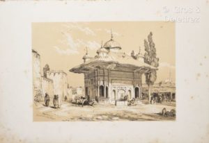 [Turquie]. LEWIS (John Frederic). Illustrations of Constantinople, made during a Residence in that City in the Years 1835-6. London, McLean, [s.d. - v.1838]. In-folio, [2] f. (titre, dédicace et table), 26 pl. (dont frontis.), demi-basane vert, titre doré sur le plat sup. (déboîté, toutes les feuilles volantes, en l'état, mouill., moisissures marginales sur 2 pl. de l'éditeur). Intéressant recueil composé de 28 lithographies de John Frederic Lewis illustrant Constantinople d'après les compositions originales de Coke Smyth. Il se compose d’un frontispice, une page de titre illustrée d'une vignette, un feuillet de dédicace avec la liste des planches au verso et 24 planches dont deux comportant une lithographie chacune. (Abbey, 394 ; Blackmer, 1015 ; Brunet, III-1040).
