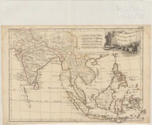 [Asie du Sud-Est]. [L'INDE ORIENTALE et ses îles] Восточная Индия и её острова. [v.1793?]. 1 carte gravée sur cuivre, env. 31 x 45 cm. sur feuille 32,5 x 48,4 cm., contours coloriés (petit manque au niveau de la pliure centrale, mouill. marginales sur 2 coins, discrètes petites taches sur la carte). Carte russe des Indes orientales et ses îles couvrant l'Inde, le Bangladesh, le Myanmar, la Thaïlande, le Cambodge, le Vietnam, la Malaisie, l'Indonésie, ainsi que le golfe du Bengale, l'océan Indien, la mer de Java et des parties de la Chine et de l'archipel malais. Elle montre les territoires de cette région avec des frontières détaillées et des annotations en cyrillique, indiquant les noms des régions et des villes. Elle est ornée d’un cartouche de titre décoratif dans le coin supérieur droit.