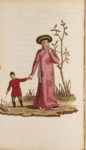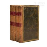 [Chine]. BRETON DE LA MARTINIERE (Jean Baptiste Joseph). La Chine en miniature, ou Choix de costumes, arts et métiers de cet Empire, représentés [en] gravures, la plupart d’après des originaux inédits du cabinet de feu M. Bertin Paris, Nepveu, 1811. 4 volumes in-18, veau bronze glacé et peint époque, dos lisse fauve, pièces de titre et tomaison maroquin rouge, petit fleurons à motif architectural chinois répété, et filet dorés, roulette dorée encadrant les plats et l'intérieur, tranches dorées (légers frott. aux coupes, coiffes et coins, travaux de vers marginaux p. 125-144, et en marge de la dernière pl.). Edition originale des 4 premiers tomes de ce bel ouvrage illustré. Deux volumes supplémentaires ont paru en 1812. Elle renferme 80 planches gravées et coloriées, dont 4 frontispices, montrant des scènes, paysages et personnages de la Chine.