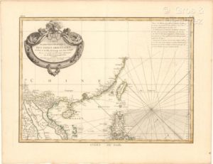 [Indes orientales]. BONNE (Rigobert). Carte hydro-geo-graphique des Indes orientales. A Paris, Lattré, 1771. 1 carte sur 4 feuilles gravées sur cuivre env. 30 x 41 cm. sur feuilles 38 x 49 cm., limites coloriées (bel exemplaire). Edition rare et peu commune de la carte des Indes orientales en 4 feuilles par Rigobert Bonne. Cette carte couvre les Indes orientales, s'étendant de la mer d'Arabie aux Philippines, et du Tibet et de la Chine méridionale jusqu'à Timor et Java, incluant des régions comme le Royaume de Siam, le Vietnam, Hainan, Taïwan, ainsi que des zones côtières telles que Macao, Canton, et les détroits de Singapour et de Malacca. Elle est ornée d’un élégant cartouche de titre décoratif.