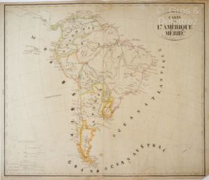[Americana]. CARTE DE L’AMERIQUE MERID[IONA]LE. Bruxelles, [c.1850]. 1 carte muette gravée, ajout manuscrit, par Edmond Schoonbroodt de Liège, 56 x 65,5 cm. (feuille). (Petit manque au coin inf. droit). Rare carte d'Amérique du Sud en partie manuscrite. Carte muette imprimée, joliment rehaussée et complétée à l’encre par Edmond Schoonbroodt, de Liège (signature à l’encre dans le cartouche, et mention « Cartes faites par Edmond » au verso). Elle est enrichie de toponymes et rehaussée de limites aquarellées. L’auteur des annotations et coloris est peut-être d’Edmond Schoonbroodt (1876-1940), avocat liégeois, docteur en droit, mais surtout auteur, sous le pseudonyme de Rodolphe de Warsage, de nombreuses pièces des genres les plus variés (comédies, opérettes, vaudevilles, contes et romans, etc.). L’Etablissement géographique de Bruxelles, fondé en 1830 par Philippe Vander Maelen, s’était fait une spécialité d’impressions de cartes administratives et topographiques, globes, atlas, dictionnaires, etc., et proposait également des « Globes, cartes et atlas à l’usage de toutes les maisons d’éducation », dont des « atlas et cartes muettes ». Le Catalogue de l’Etablissement (Bruxelles, 1850, p. 17) souligne les bienfaits de tels outils : « Parmi les nombreux avantages que présente l’enseignement de la géographie au moyen des cartes muettes et écrites, il faut surtout tenir compte de celui qui aide la mémoire : en effet, par ce nouveau mode d’étude, les jeunes gens en inscrivant à chaque signe respectif les localités ou leurs indications, retiennent presque sans effort et en quelque sorte par un procédé pratique, tout ce qu’il convient qu’ils sachent d’une science dont la nomenclature a souvent fatigué le zèle le plus soutenu ».