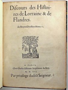 (Belgique & France) - Ens. 2 ouvr. - [ESTIENNE, Charles].- Discours des histoires de Lorraine & de Flandres. Paris, Charles Estienne, 1552. In-8° : [56] ff. (soulignement dans le texte et une note ms. au f. n1). Rel. XIXe s. : bradel plein papier...