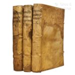 . [Americana]. TORQUEMADA (Fray Juan de). Primera [segunda & tercera] parte de los veinte i un libros, rituales i monarchia indiana, con el origen y guerras de los Indios ocidentales, de sus poblaçones, descubrimiento, conquista, conversión y otras cosas maravillosas de la mesma tierra Madrid, Nicolas Rodriguez Franco, 1723. 3 vol. in-folio, parchemin ivoire souple d'époque, dos lisse, titre et tomaison manuscrit au dos (charnières fendues, réparations sur les dos et plats, gardes renouvelées, saliss., trous de vers minuscules sur le texte jusqu'à p. 260 du t.3 (sans gravité, texte très lisible), des défauts marginaux sans gravité qq.-uns réparés). Seconde édition, corrigée et la plus complète, de cet important ouvrage sur le Mexique ancien. "[...] recueil indispensable à quiconque désire connaître l'histoire ancienne du Mexique et de ses populations, aussi presque tous les écrivains spéciaux lui ont-ils fait de nombreux emprunts" (Leclerc). Chaque volume s’ouvre sur un beau titre illustré répété, gravé sur cuivre. Le tome premier renferme une carte dépliante gravée sur cuivre montrant le continent américain et centrée sur l’Océan Pacifique. (Sabin 96212 ; Leclerc 70 & 1289).