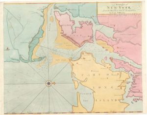 [New York]. TIDDEMAN (Mark). A draught of New York from the Hook to New York Town. Londres, I. Mount & T. Page, [mi-XVIIIe s.], 1 carte gravée sur cuivre, env. 46 x 57 cm. sur feuille env. 47 x 61 cm., coloriée à la main (petites restaurations) Carte nautique du port de New York, par Mark Tiedmann, imprimée pour I. Mount and T. Page , publiée pour la première fois en 1732 dans le quatrième livre de l'ouvrage The English Pilot, qui fit l’objet de nombreuses éditions entre 1671 et 1803. Elle illustre New-York avec les quartiers de Harlem et Westchester, et montre également Staten Island ainsi qu'une partie de Long Island. Elle est ornée d’une rose des vents. (Augustyn & Cohen p. 66-67).