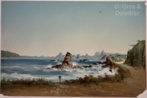 [Brésil]. [Dessin]. LANGEROCK (Henri, 1830-1915). [Paysage côtier, probablement au Brésil, avec …