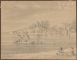 [Brésil]. [Dessin]. ROMIEUX (Osmond). [Vue de la Gloria]. Dessin original au crayon sur papier fort. Env. 113 x 146 mm., collé sur sur feuille brune 134 x 188 mm. Belle vue de La Gloria à Rio de Janeiro depuis la plage de Flamengo signée O. Romieux en bas à gauche. Osmond Romieux (1826-1908), officier de marine français, était également un peintre orientaliste. Inspiré par ses voyages, il a capturé dans ses œuvres des scènes maritimes et des paysages exotiques, mêlant précision navale et sensibilité artistique.