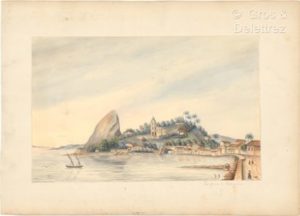 [Brésil]. [Dessin]. [ROMIEUX (Osmond), attribué à]. La Gloria à Rio-Janeiro (titre manuscrit sur le papier support). Aquarelle originale sur papier fort. Env. 184 x 290 mm., monté sur feuille 272 x 380 mm. Vue de La Gloria à Rio de Janeiro depuis la plage de Flamengo. Osmond Romieux (1826-1908), officier de marine français, était également un peintre orientaliste. Inspiré par ses voyages, il a capturé dans ses œuvres des scènes maritimes et des paysages exotiques, mêlant précision navale et sensibilité artistique.